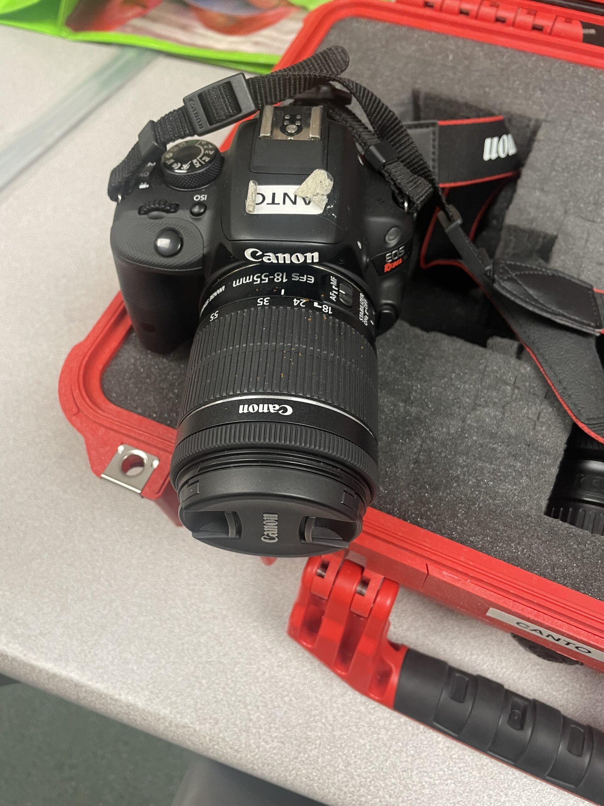 Canon Rebel SL1 100D with EF-S 18-55MM IS lens includes strap, one battery, battery charger (no cable) and lens cap.
